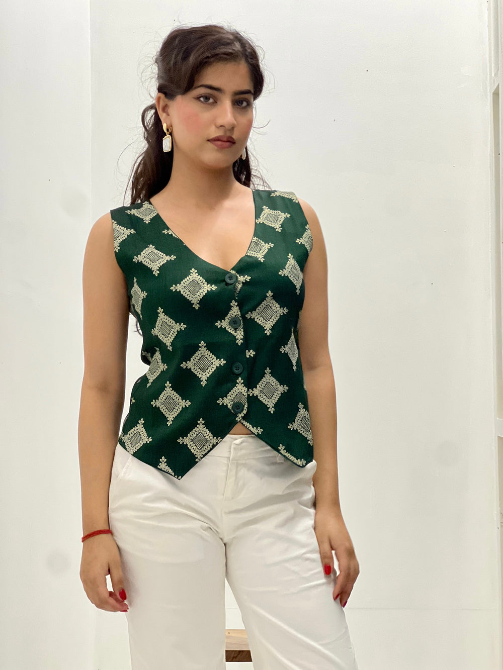 V neck, buttons in front waistcoat.